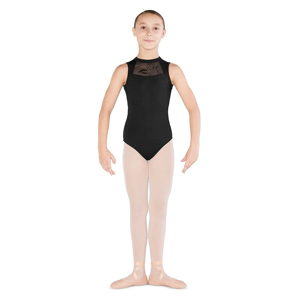 Stand out in this glitter print mesh high neck tank leotard. A glitter print mesh insert decorates the front yoke. Mock neck clasps in the back for easy wear. Glitter print mesh back features a bow back double keyhole design for a touch of elegance.