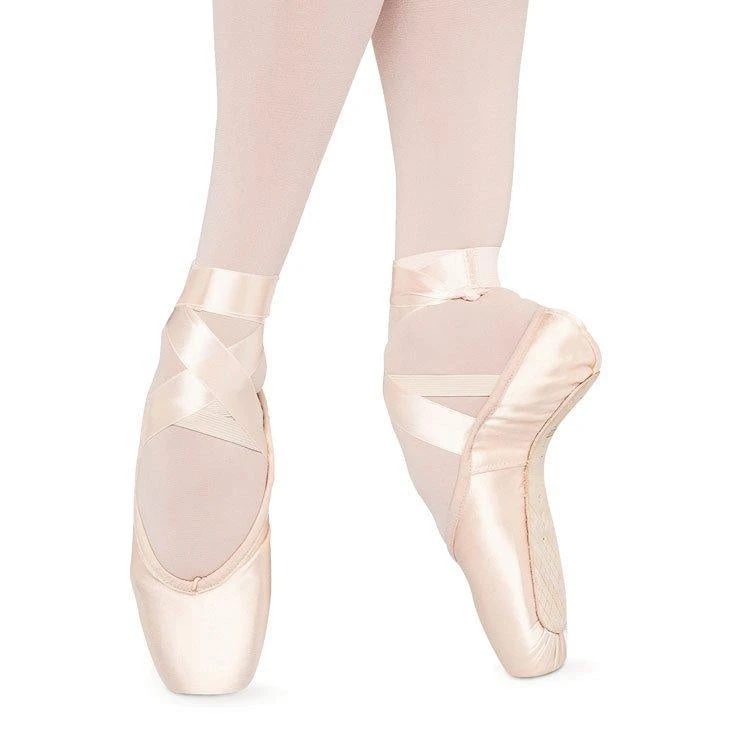 The Aspiration pointe shoe is designed to give the dancer when ‘en pointe’ the feeling of being elevated up out of the shoe and held away from the floor. The shank/insole has an extra board shortened under the metatarsal which provides stability and support however this extra strength in the shank/insole does not extend to the heel. This allows the foot to arch at the three/quarter point with the heel being able to arch away from the foot. The platform is both high and wide to allow maximum balance when ‘en pointe’.