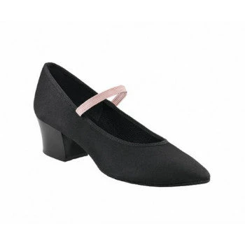 The Capezio Academy Character shoe is suitable for character training, ballet examinations and an introductory shoe to ballroom. Featuring a canvas upper with a suede sole, pre-attached elastic with snap closure, and a contoured cuban 1.5″ heel height.