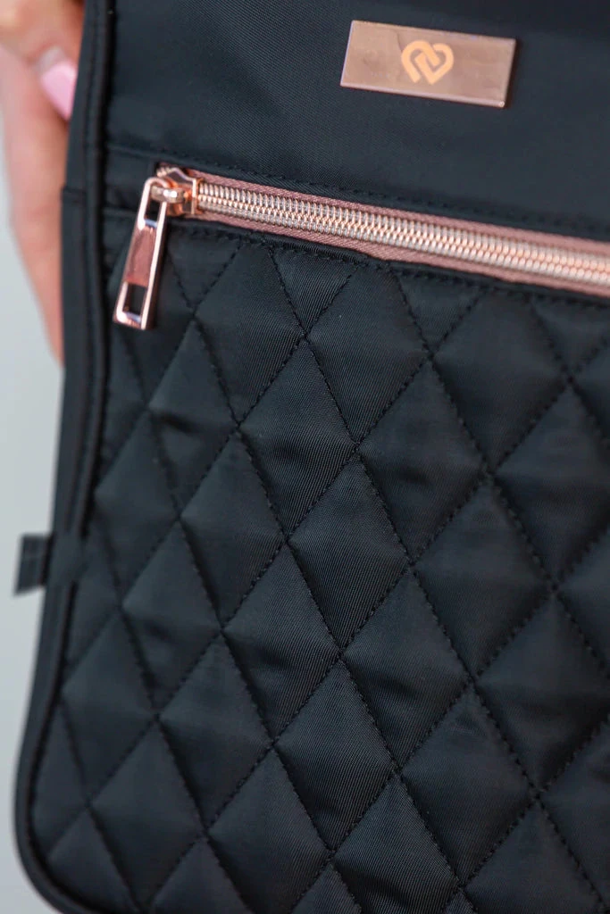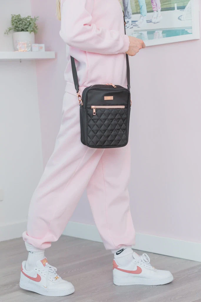 The Claudia Dean MINI BAG will be your go to accessory! Featuring rose gold detailing, a beautiful quilted surface, multiple compartments and an adjustable shoulder strap so you can be on the go! The Mini Bag fits pointe shoes, water bottles, ballet shoes, hair accessories, makeup, notebooks – this will be the most convenient bag you own.
