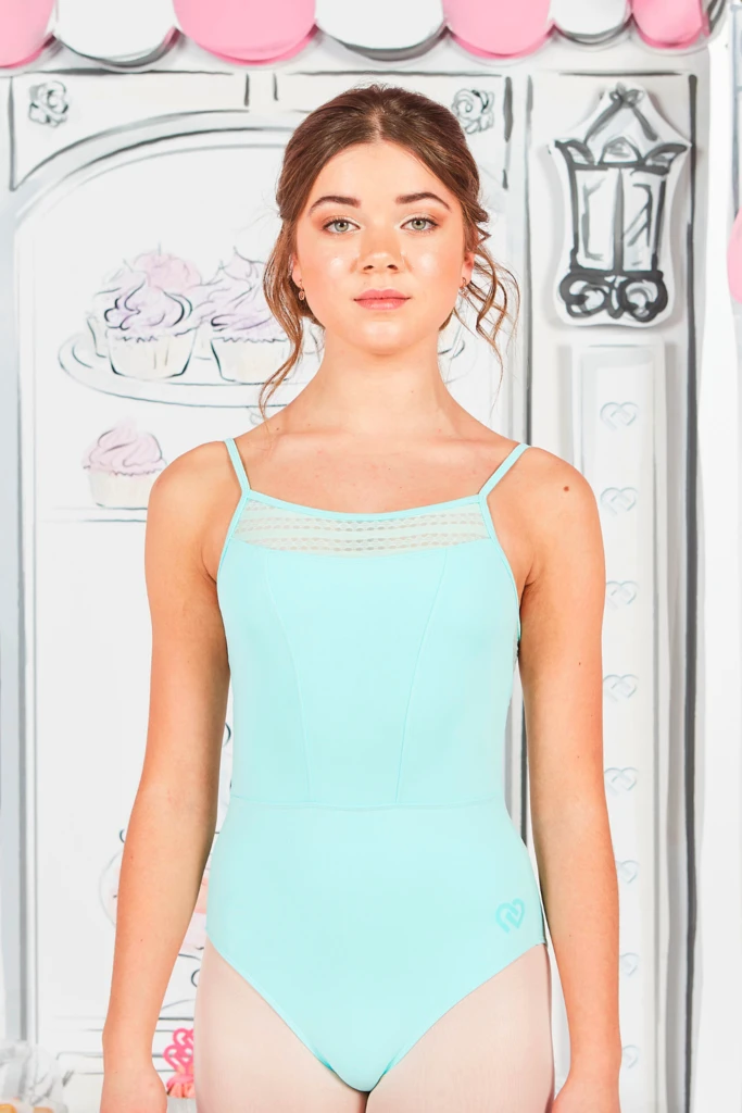 Our Alice Peppermint leotard features rose gold adjustable straps for extra style & comfort. This design is our most flattering one yet, with beautiful soft frill lace detailing panels front & back, and V line seams that elongate the body.