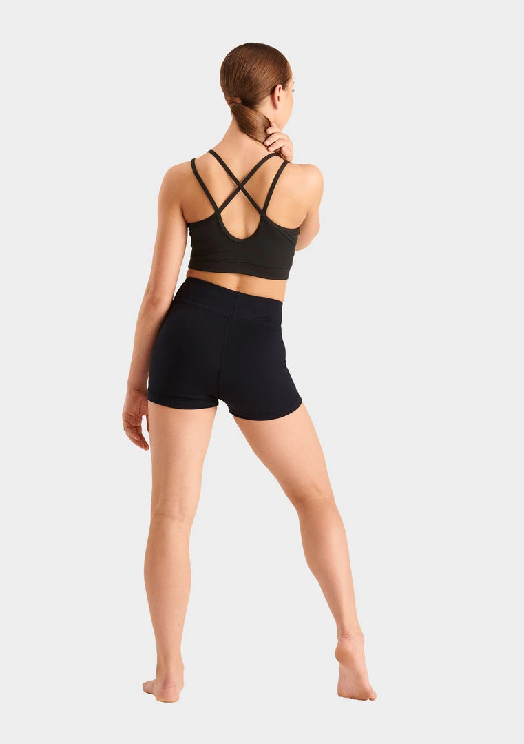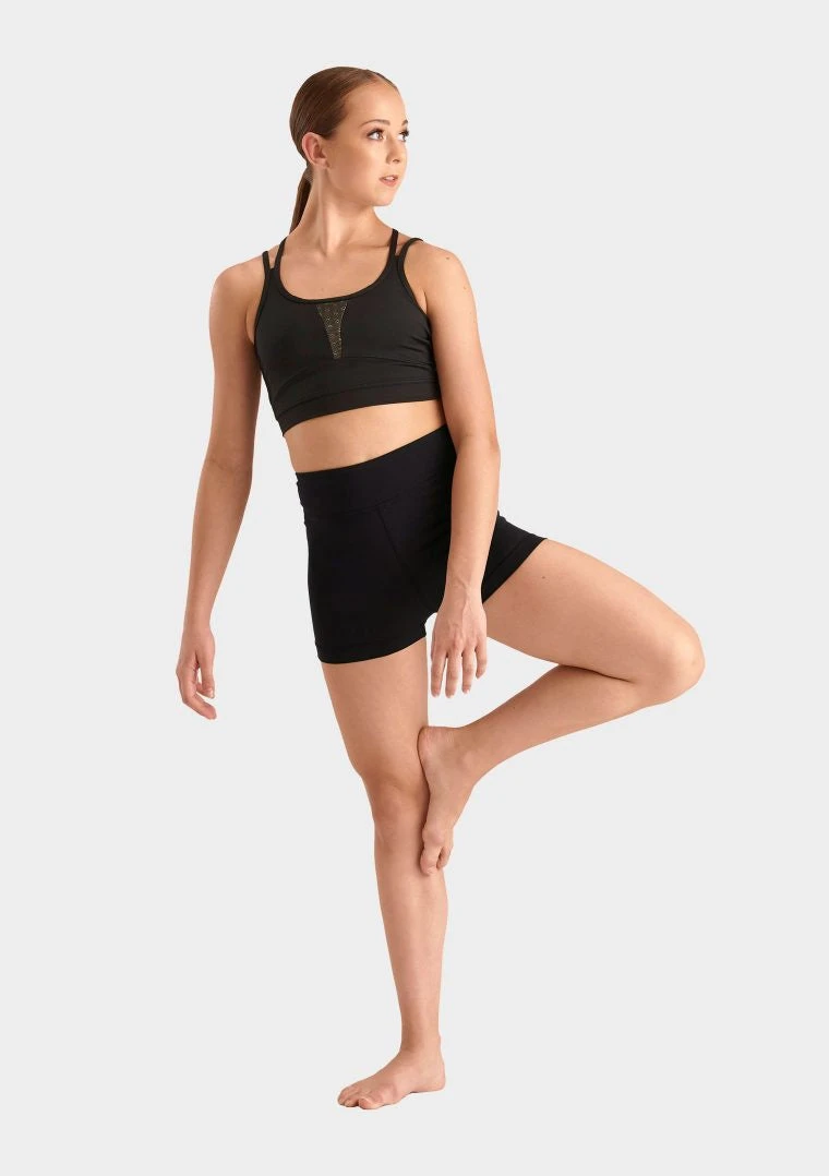 Double straps cropped top features a centre front mesh insert, shaped under bust band and back crossed straps detail.