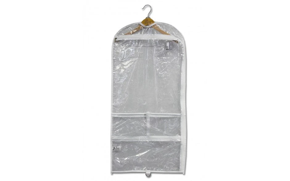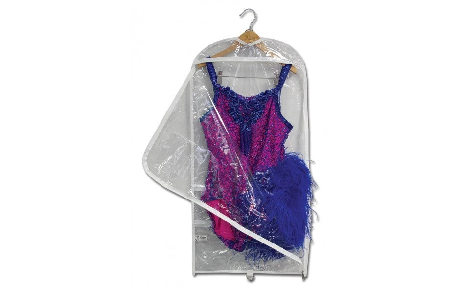 Our custom garment bag is made of medium weight, clear, PVC – Very durable holds everything you need for each costume.