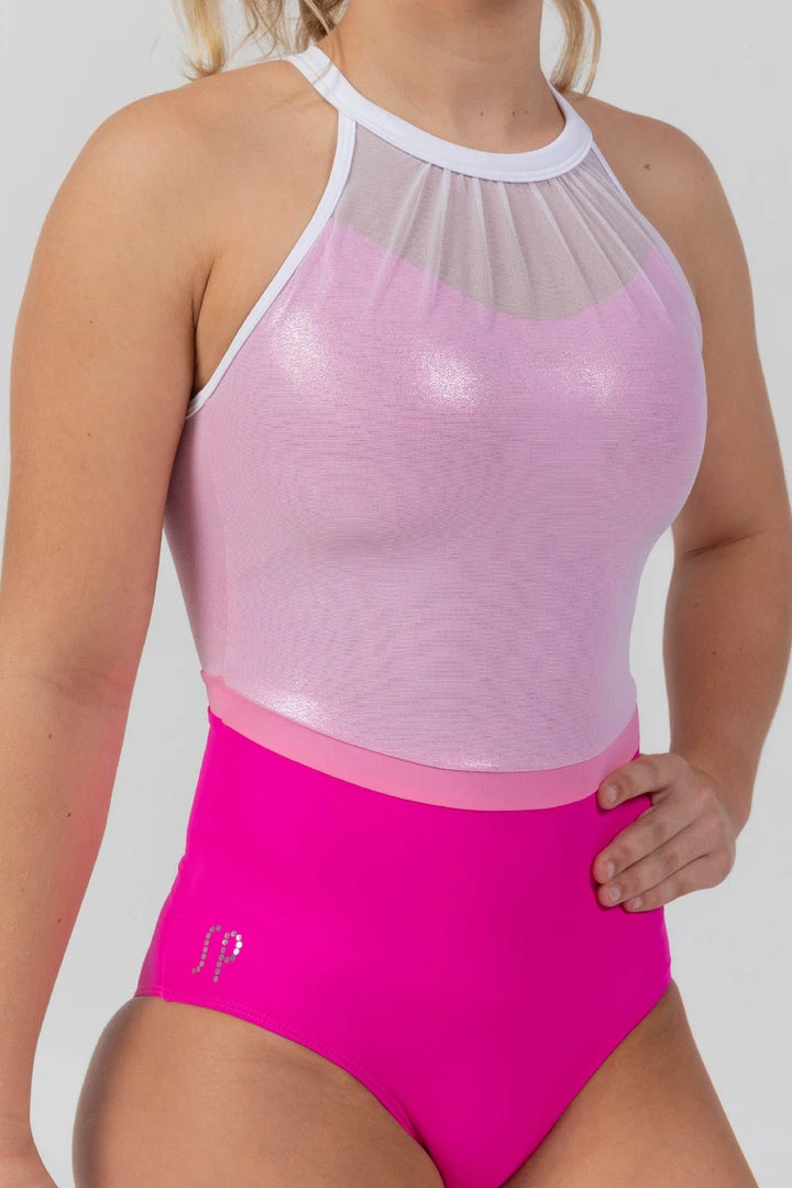 A delight to wear in the most amazing pink-coloured tones. The Ayla leo features a subtle double layer design with a pink colour mystique underlay and a mesh overlay. The front mesh has a gather through the neckline for that added femme feeling. Styled in a halter neck shape that sits higher on the neck with added neck band, clasp and back keyhole for ease of movement. Made from a combination of our recycled matt lycra, mystique and mesh fabrications that are quick drying. We added a full front lining and elasticated legs for the ultimate in coverage and comfort. Sylvia P branded logo on the front hip.