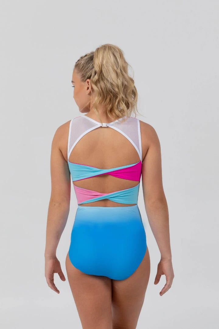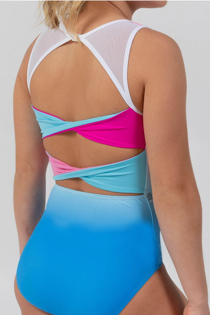 Sparkle and shine in this fun ombre sublimated design that flows from cornflower blue into beautiful pinks. Styled with a round neckline shape and additional back neck clasp so that it is easy to get in and out of. A dazzling sequin motif cascades over the bodice and creates a belt shape. The back design is all features: mesh panels and contrast colour twisted straps, creating an open look. We made this leo using our signature printed stretch fabric that is durable and quick drying plus a full front lining and elasticated legs for the ultimate in coverage and comfort. Sylvia P branded sequin logo on the front hip of this garment.