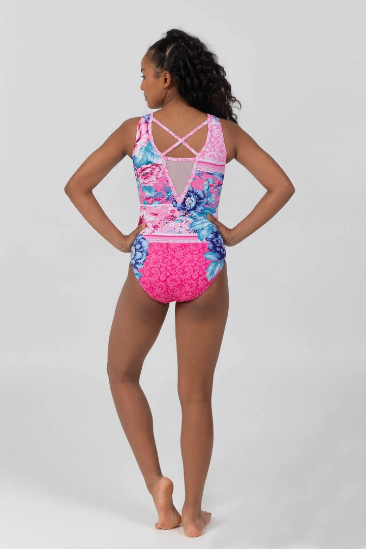 A signature shape in a gorgeous new hand painted Sylvia P exclusive print. Styled in a V-neckline shape with an additional mesh panel and dainty criss-cross straps through the back. Florals and lace combine in pink and blue tones to create our signature Melrose print. We made this leo using our signature printed stretch fabric that is durable and quick drying plus a full front lining and elasticated legs for the ultimate in coverage and comfort. Sylvia P branded logo on the front hip of this garment.