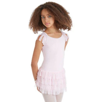 NEW! The Capezio Short Sleeve leotard for children features layers of fringe detail, a keyhole open back and ballet legline. Skirt sold separately. 90% Nylon/10% Spandex.