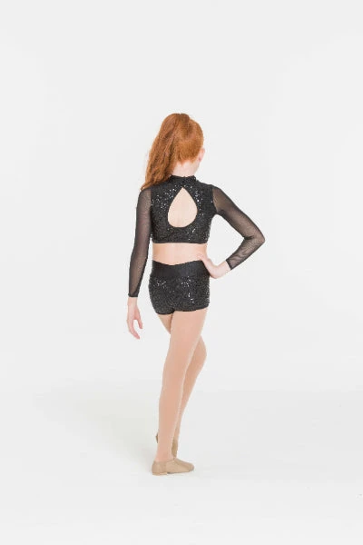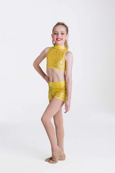 These shorts match with the Attitude Sequin Crop or with the Cabaret Crop Top and Downtown Long Sleeve Crop