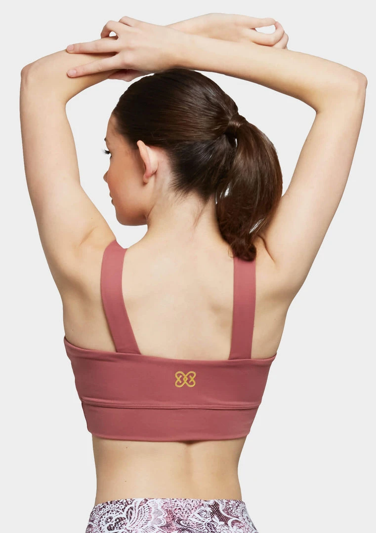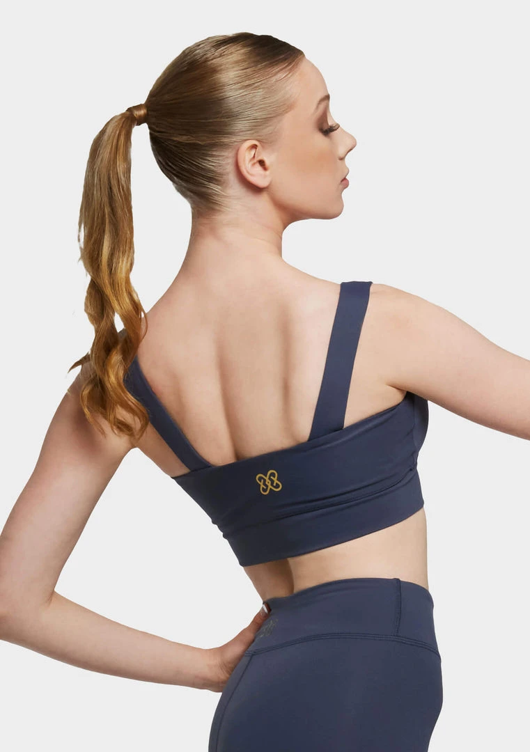 Cropped top featuring wide shoulder straps and waist band.