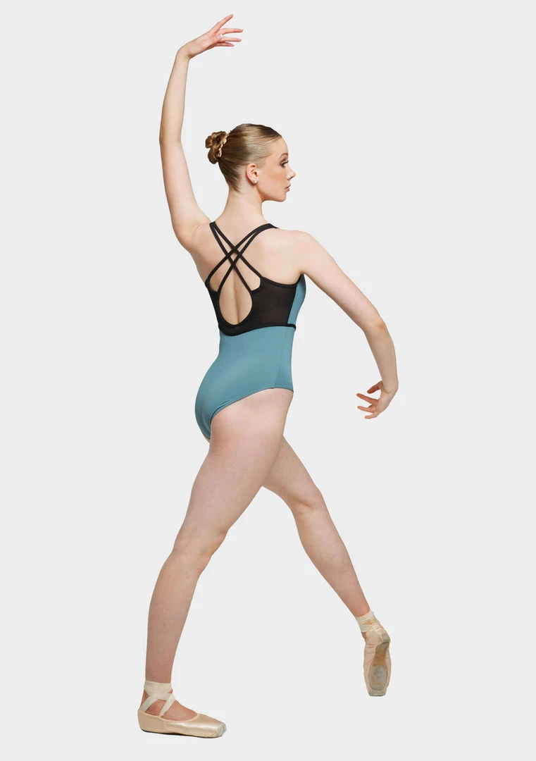 This leotard features bodice mesh panelling and a cross strap design at the back.