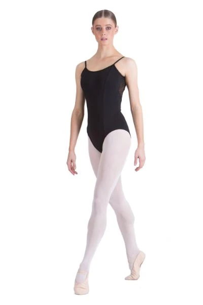 The Macey Leotard features a camisole strap design with a v-shape mesh scooped back. The perfect dance fashion leotard.Â