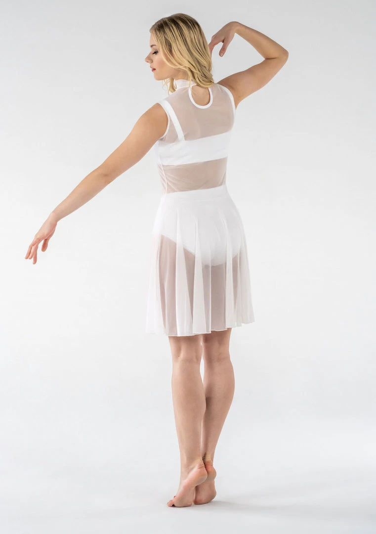 A striking design for the modern performer. The Mesh Performance Dress features a high neck line, transitioning into a gathered skirt.