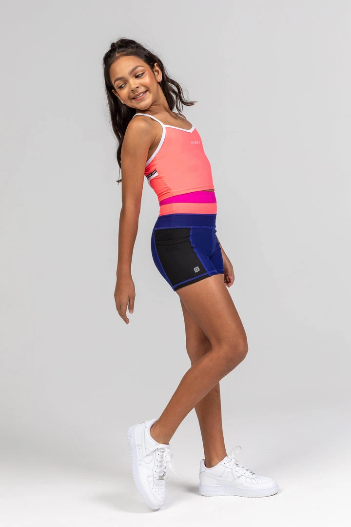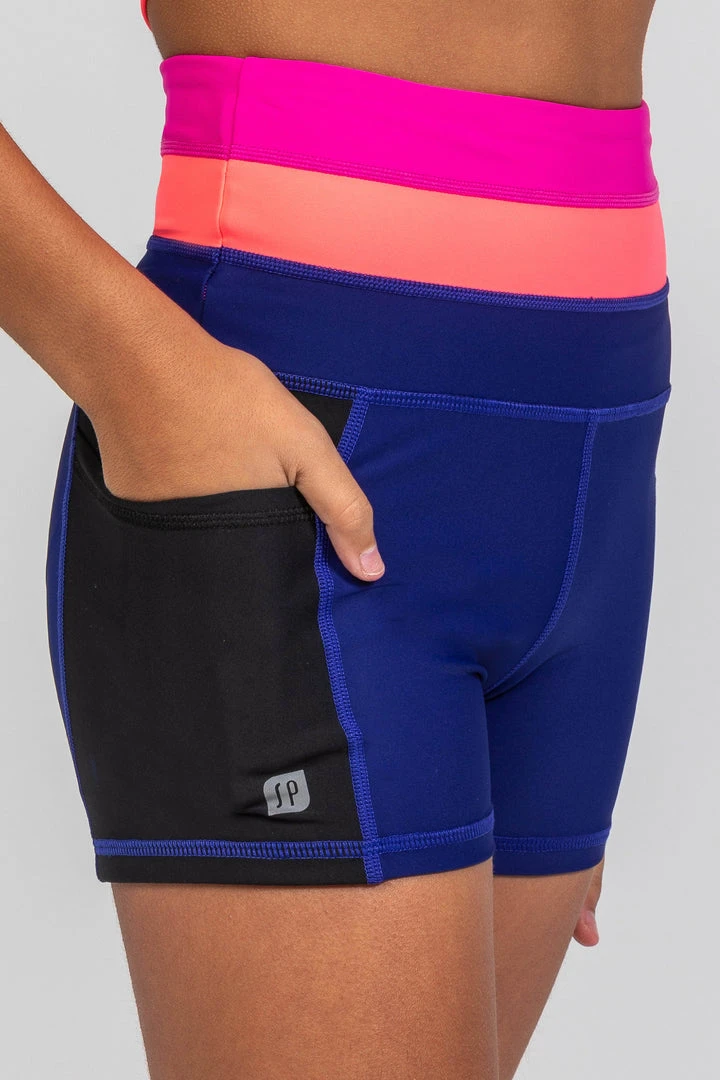 This style is a colour-blocked version of our classic On-The-Go Short. The wider waistband is supportive without being restrictive, it sits higher on the body above the belly button, plus we added double pockets to the sides to stash your important stuff whilst you are out there being all active! This short features smooth finish flatlocked seams, so no digging in during training. Made from our SP Activate fabrication which is quick drying, breathable and moisture wicking with a 4-way stretch and firm hold. Sylvia P branded reflective logo on the leg. Wear with the matching Dolce Vita Crop Top.