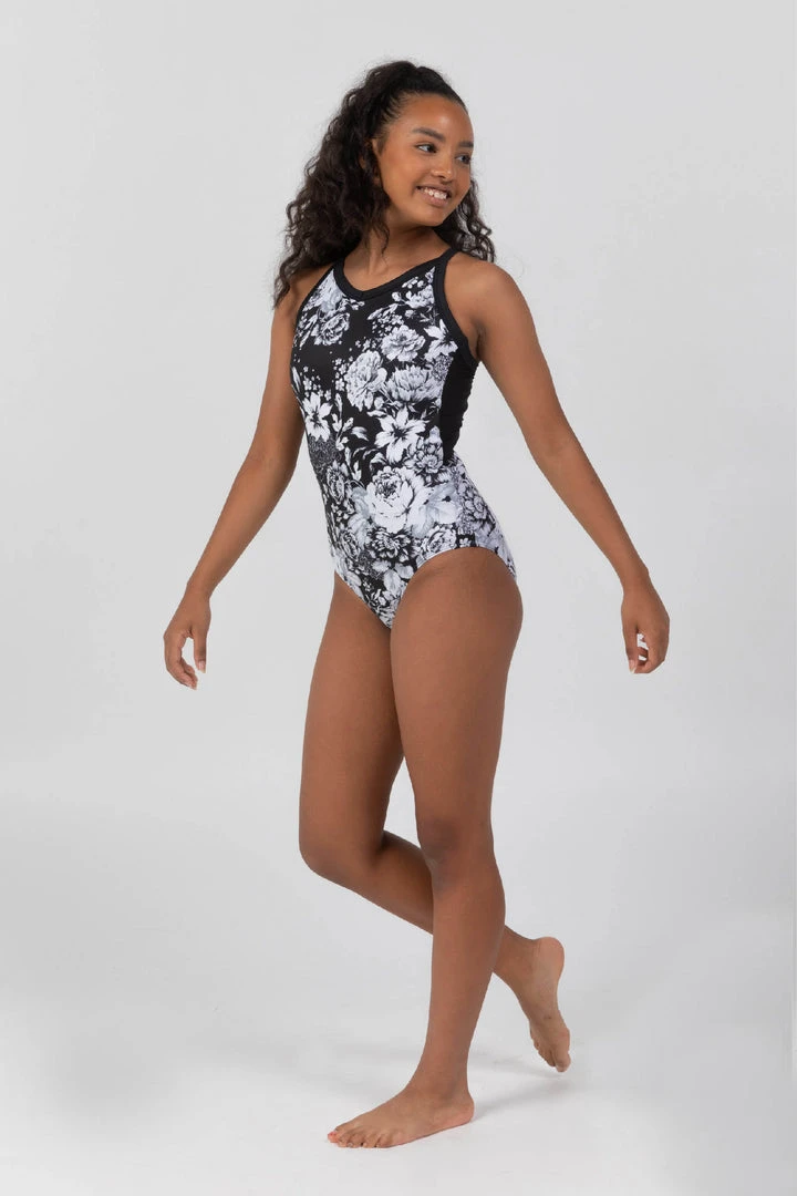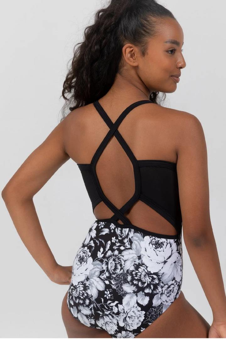 A delight to wear in a classic monochrome colour palette. Black and white has never looked so good. Designed to make you feel empowered, this hand painted print is exclusive to Sylvia P. Styled in a strappy V-neckline shape with mesh panels and criss-cross straps through the back for that additional wow-factor when training. We made this leo using our signature printed stretch fabric that is durable and quick drying plus a full front lining and elasticated legs for the ultimate in coverage and comfort. Sylvia P branded logo on the front hip of this garment.