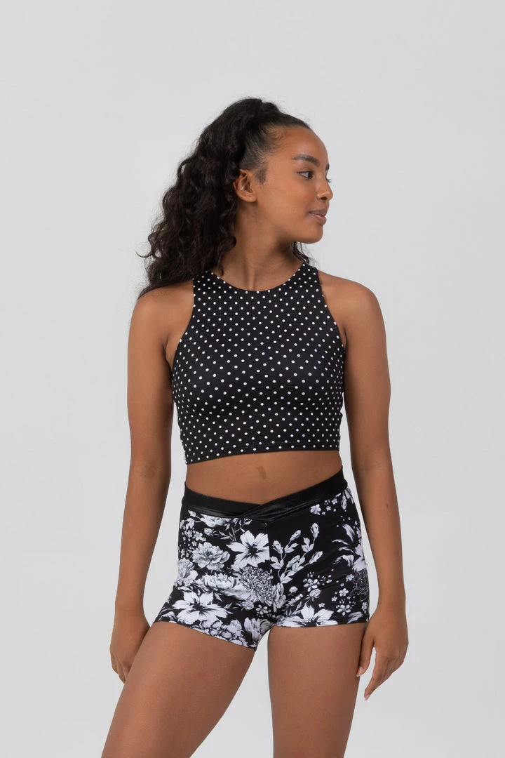 Feel strong and capable when wearing these shorts. Styled in our exclusive monochrome floral pattern. We designed them with a cross over waistband detail through the front so that you can handstand with ease. Made from our signature printed stretch fabric that is durable, flexible, and quick drying plus our wetlook fabrication through the waistband to help hold them up when the going gets tough. Sylvia P branded logo on the front leg.