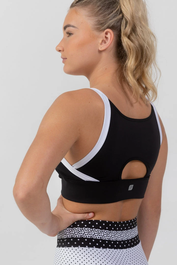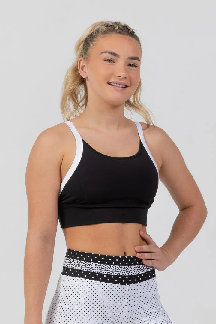 A new style staple, the Macpherson Crop Top is classically styled in black and white with wider coverage at the front, wide folded hemband and full coverage through the back with small keyhole. The design through the side features a wrap detail which is comfortable. Made from our classic recycled matt fabrication that is quick drying, flexible and designed to move with you. We added our “go the distance” neoprene lining that offers additional bust coverage and support when you need it most. Sylvia P branded logo on the back of this garment.