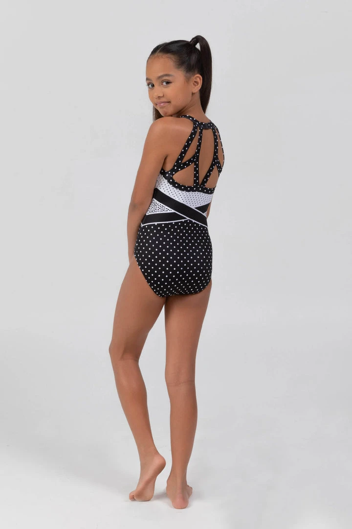 Spot the difference in our polka polka leo. Black and white micro spots have been thrown together to create this fun and edgy shape with solid black belt detail. Designed in a high neck halter style with clasp at the back neck to make it easy to get in and out of this leo. The unique back strap design is soft and comfortable yet makes a style statement. We made this leo using our signature printed stretch fabric that is durable and quick drying plus a full front lining and elasticated legs for the ultimate in coverage and comfort. Sylvia P branded logo on the front hip of this garment.
