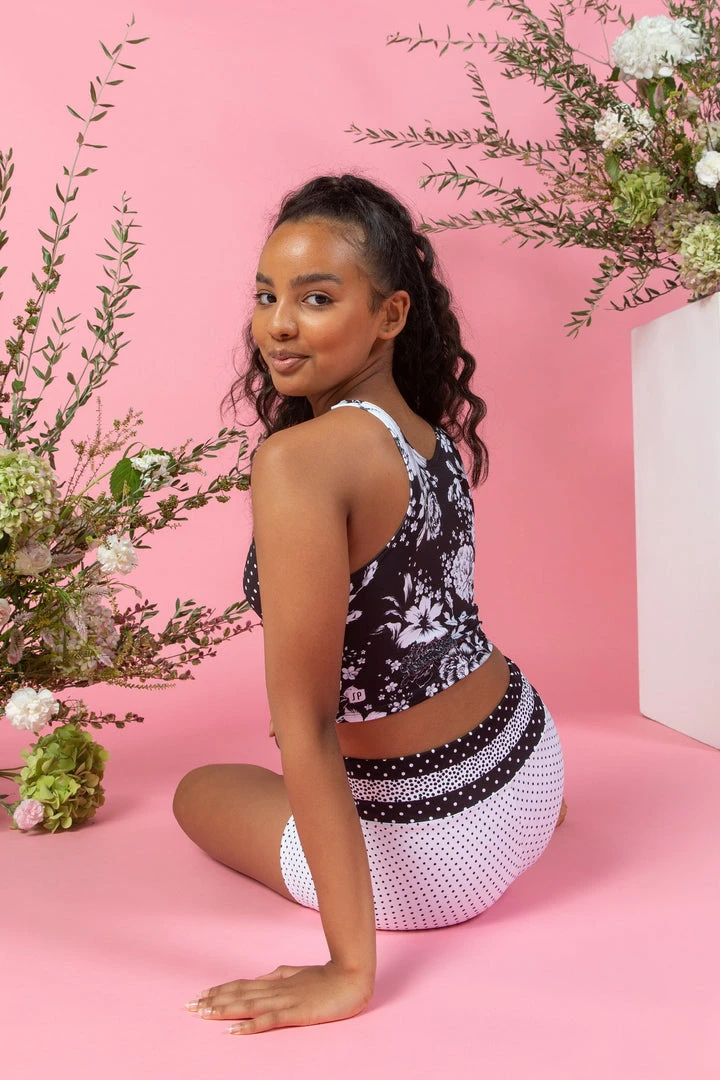 A classic single layer cropped singlet that you can wear back to front or front to back. Wear it two ways, flowers on the front or polka dots on the front. We have crafted this style so that the neckline sits in just the right spot no matter which side is the front. Featuring our classic black and white polka dot and exclusive monochrome hand painted floral. Made from our signature printed stretch fabric that is durable, flexible, and quick drying. Sylvia P branded logo on the floral side of this garment.