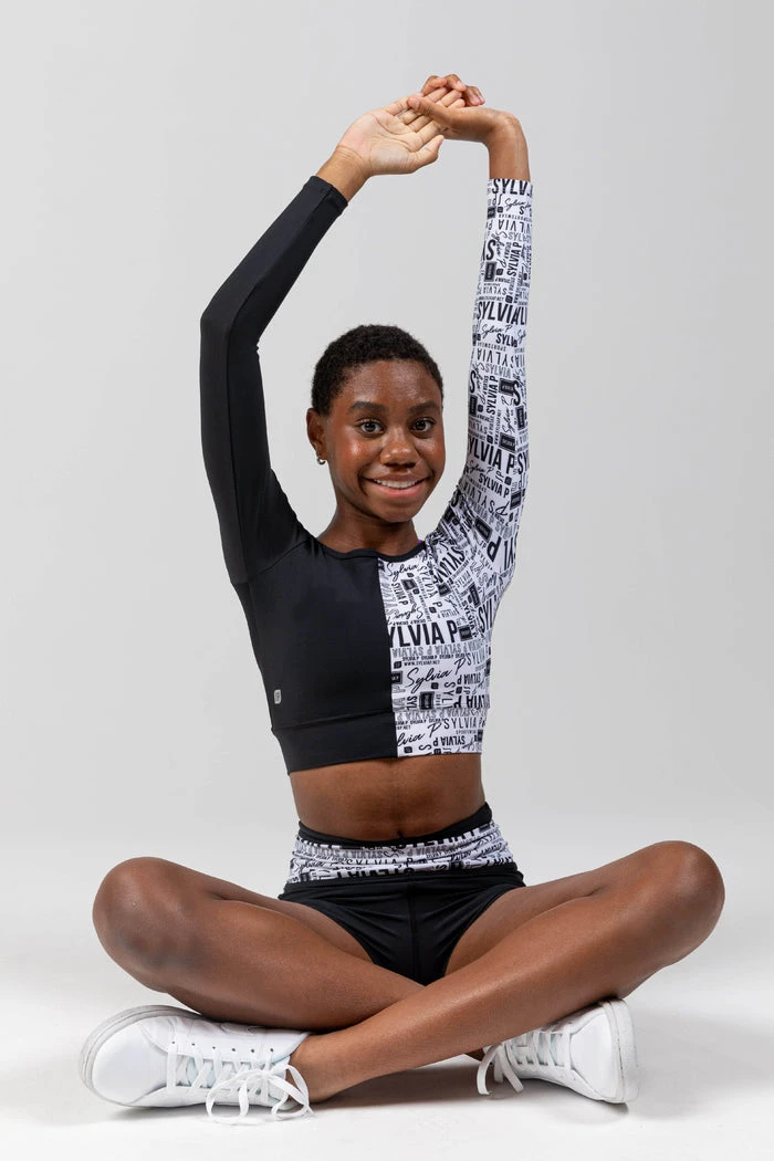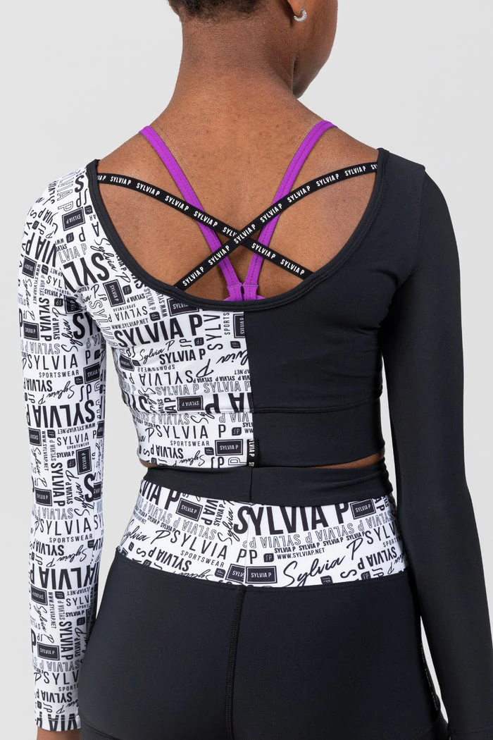 Classic black and white for all the sophisticated vibes. Designed in a cropped shape with wider hemband and long sleeves. The back features a deep scoop and Sylvia P branded criss-cross straps to hold everything together. This style features our monochromatic branded Sylvia P print. Made from our signature SP Activate fabric that is quick drying, 4-way stretch, durable and made to move with you.