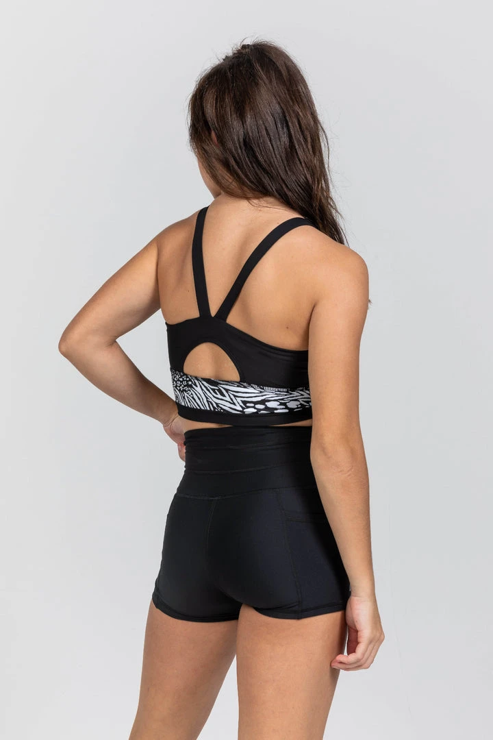 Support with a little bit of wild energy. This longer length crop top has been designed with comfort and coverage in mind. All seams are abrasion free and smooth finish. The longer length hemband allows just the right amount of coverage. Designed in a round neckline shape with flattering front panel lines, encased elastic straps & a back keyhole. Our Wilde animal print is featured in monochromatic black and white exclusively for Sylvia P. Made from our SP Activate fabrication which is quick drying, breathable and moisture wicking with a 4-way stretch and firm hold. Reflective silver SP logo on the back.