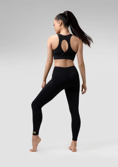 Nylon/Spandex. Full length legging with high waisted double layer band, and flat seams.