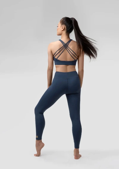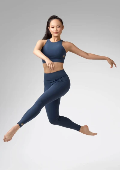 Nylon/Spandex. Full length legging with high waisted double layer band, and flat seams.