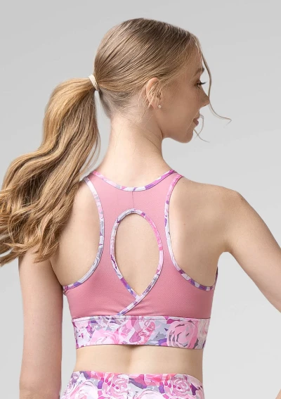 Polyester/Spandex, lined, texted Nylon mesh panel. Wide waist band, round neckline and back keyhole.